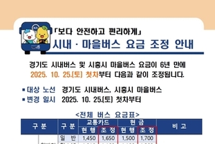 조정된 요금은 교통카드 기준으로, 경기도 시내버스 일반형의 경우 ▲성인 1,450원에서 1,650원(200원 인상)으로 ▲청소년 1,010원에서 1,160원(150원 인상)으로 ▲어린이 730원에서 830원(100원 인상)으로 오르게 된다. 시흥시 마을버스 요금은 ▲성인 1,350원에서 1,650원(300원 인상)으로 ▲청소년 950원에서 1,160원(210원 인상)으로 ▲어린이 680원에서 830원(150원 인상)으로 조정된다.