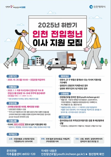 인천광역시는 인천으로 전입하는 청년들의 주거비 부담을 완화하고 지역사회에 안정적으로 정착할 수 있도록, 상반기에 이어 하반기에도 최대 40만 원의 이사비를 지원한다고 밝혔다.
