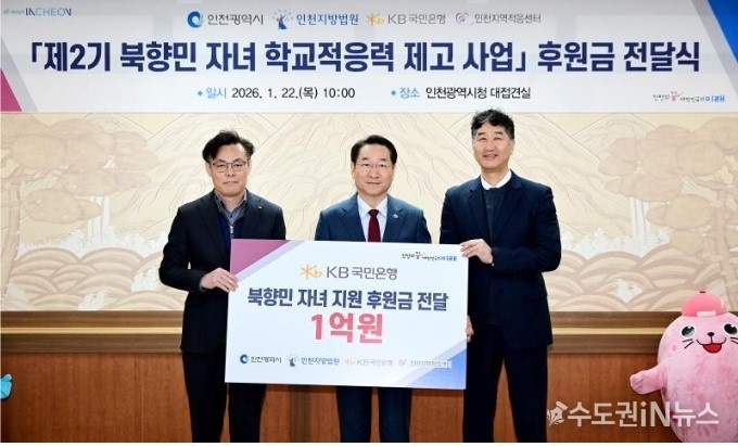 인천광역시(시장 유정복)는 북향민 자녀의 학교 적응력 향상을 위한 「북향민 자녀 학교적응력 제고 제2기 사업」 추진을 위해 1월 22일 후원금 전달식을 개최하고, 국민은행으로부터 후원금 1억 원을 전달받았다고 밝혔다.