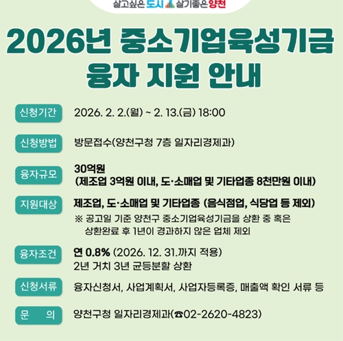 양천구(구청장 이기재)는 경기침체 장기화로 경영 부담이 가중되고 있는 중소기업과 소상공인의 자금난 완화를 위해 2026년 상반기 30억 원 규모의 '중소기업 육성기금' 융자 지원에 나선다고 3일 밝혔다.