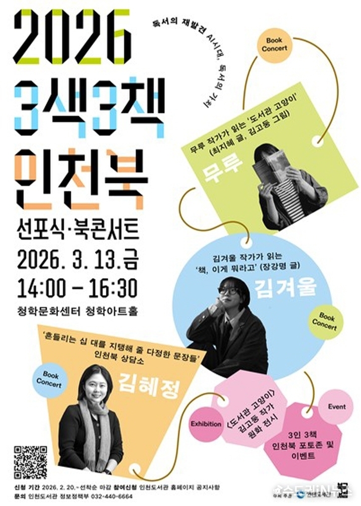 인천광역시(시장 유정복) 인천도서관은 ‘2026년 3색3책 인천북 선포식·북콘서트’를 오는 3월 13일 오후 2시 청학문화센터 청학아트홀에서 개최한다고 밝혔다.