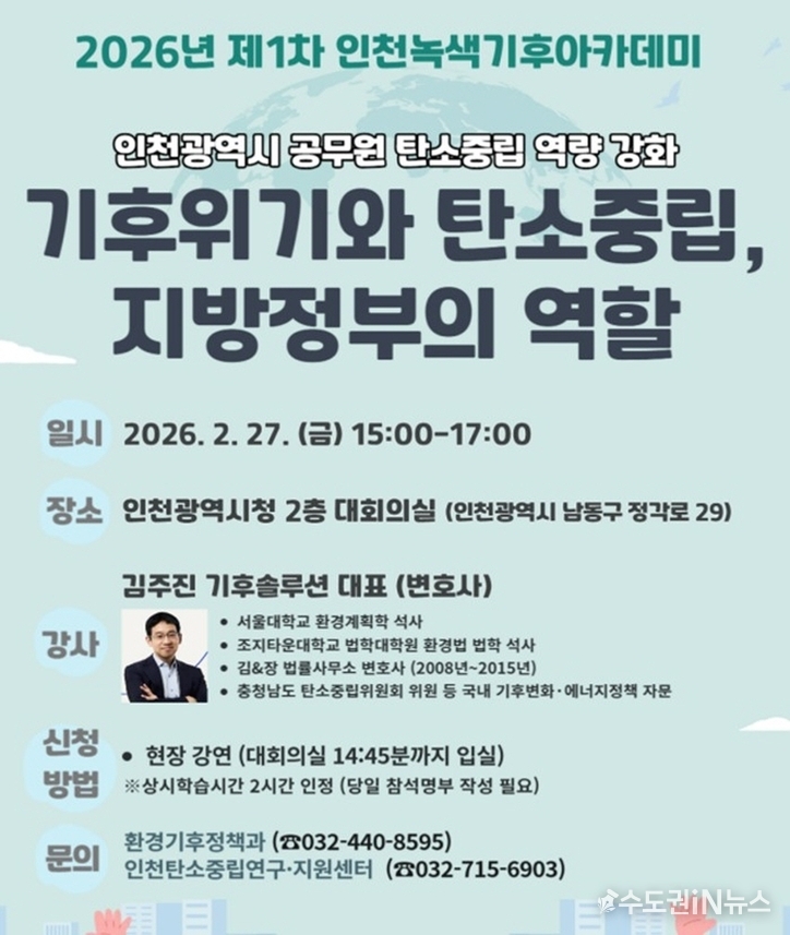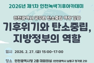 인천광역시(시장 유정복)는 2월 27일 시청 대회의실에서 공직자 및 공공기관 직원을 대상으로‘2026년 제1차 인천녹색기후아카데미’를 개최했다고 밝혔다.