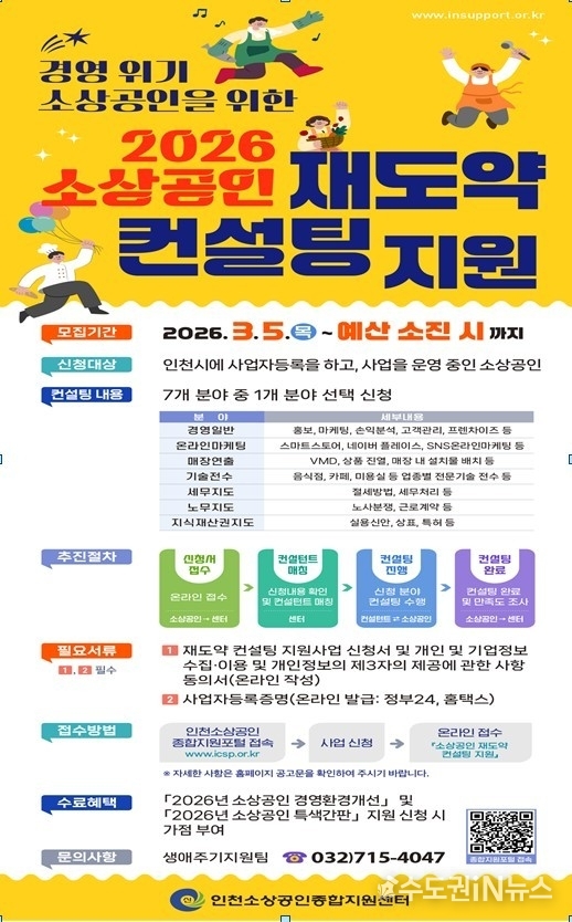 인천광역시(시장 유정복)는 오는 3월 5일부터 인천지역 소상공인을 대상으로 경영위기 극복 및 영업 활성화를 위한 소상공인 재도약 컨설팅 지원사업을 본격 추진한다고 밝혔다.