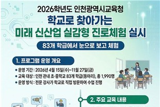 인천광역시교육청(교육감 도성훈)은 오는 15일부터 인천 관내 초·중학생교 83개 학급(동아리) 학생 1,990명을 대상으로 '학교로 찾아가는 미래 신산업분야 실감형 진로체험'을 운영한다.